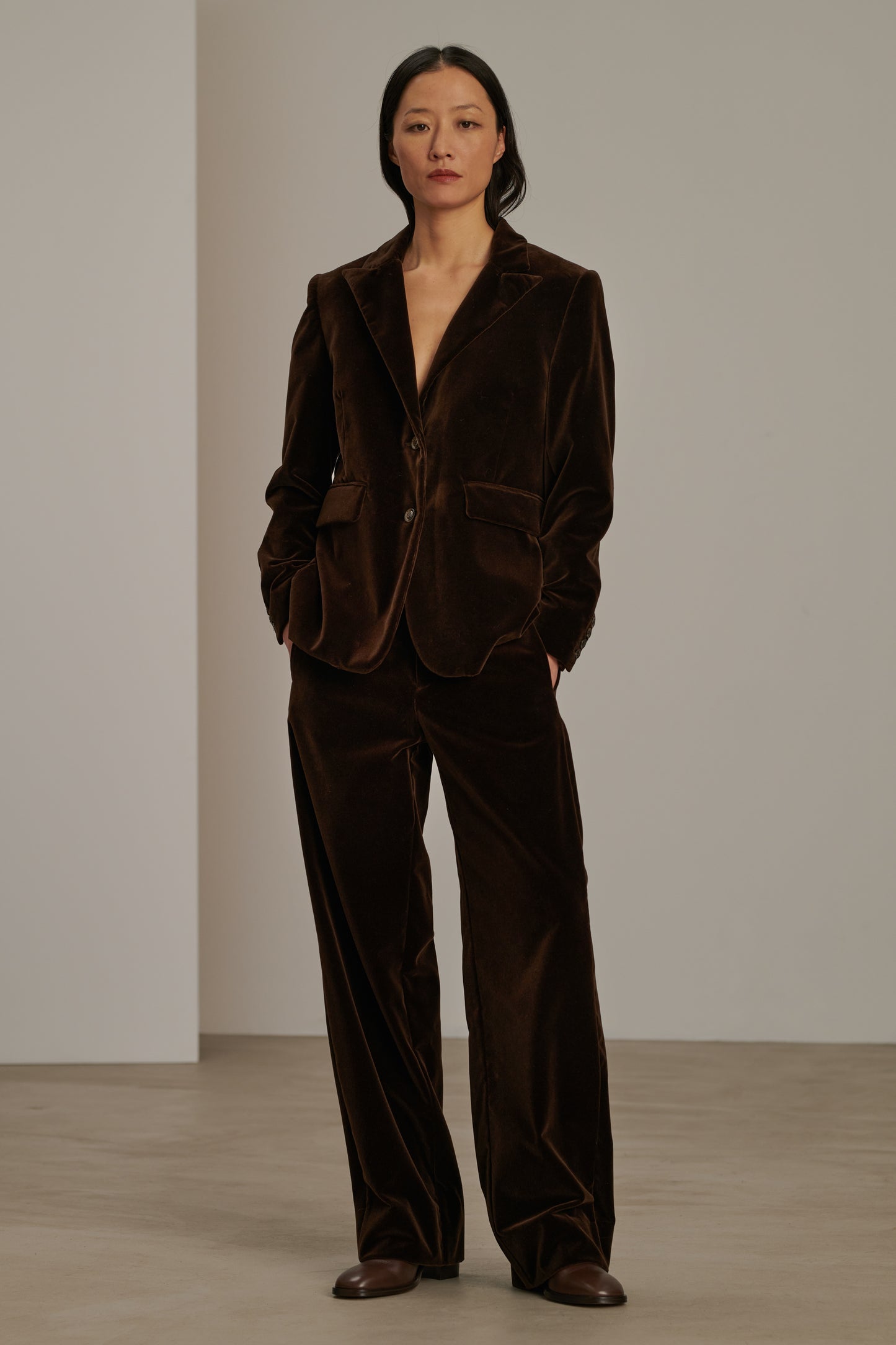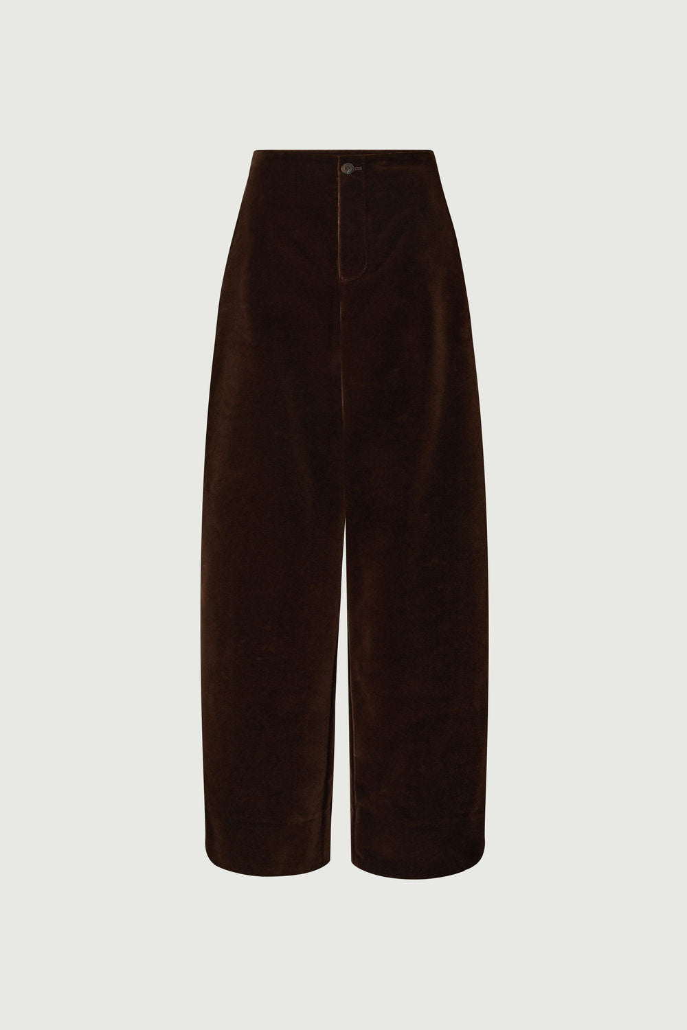 CELESTIN is a high-waisted, slightly flared pair of trousers. Its minimalist design, without a belt or pleats, suits all body shapes. The smooth velvet enhances its shiny chocolate brown hue.