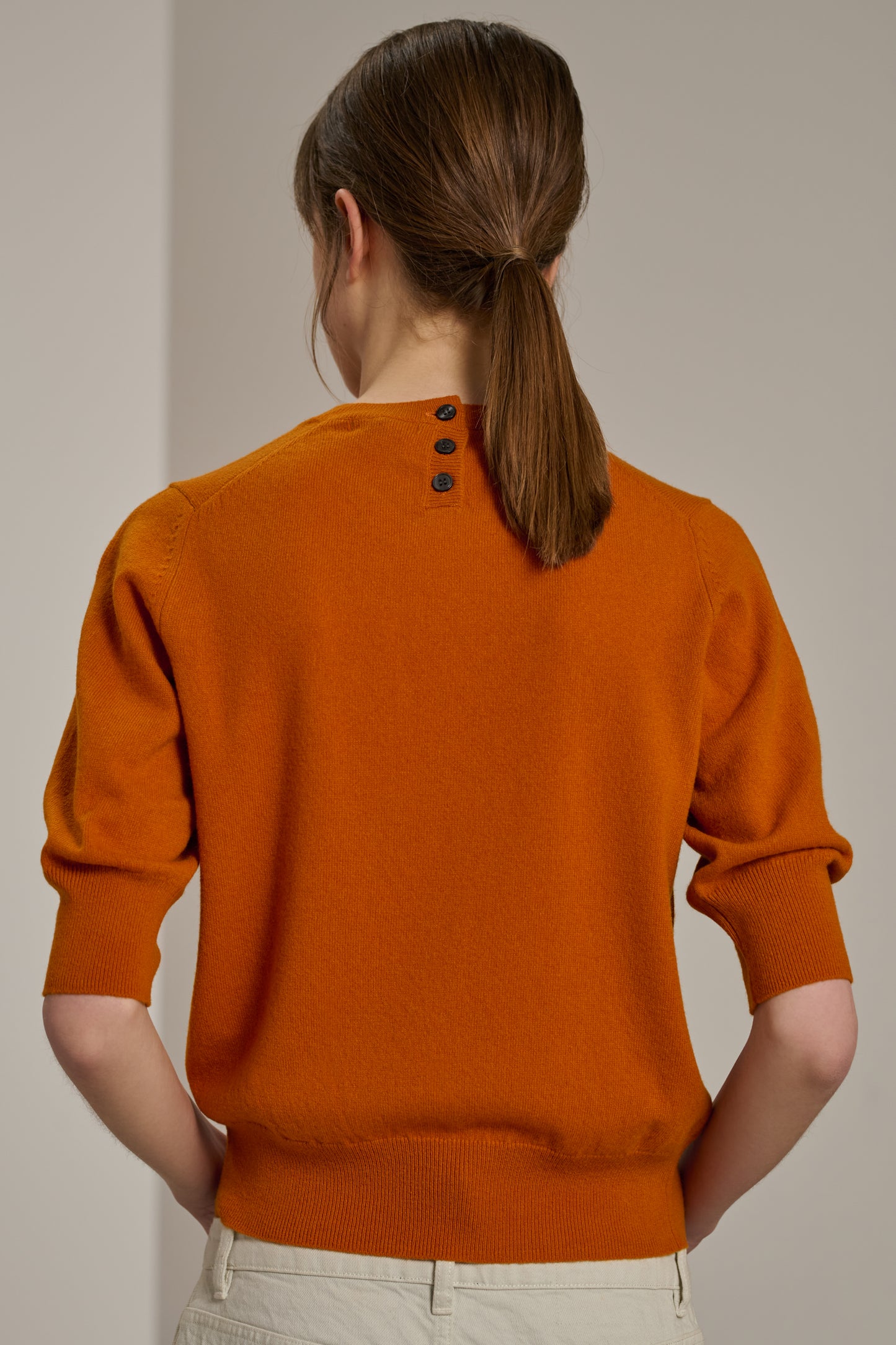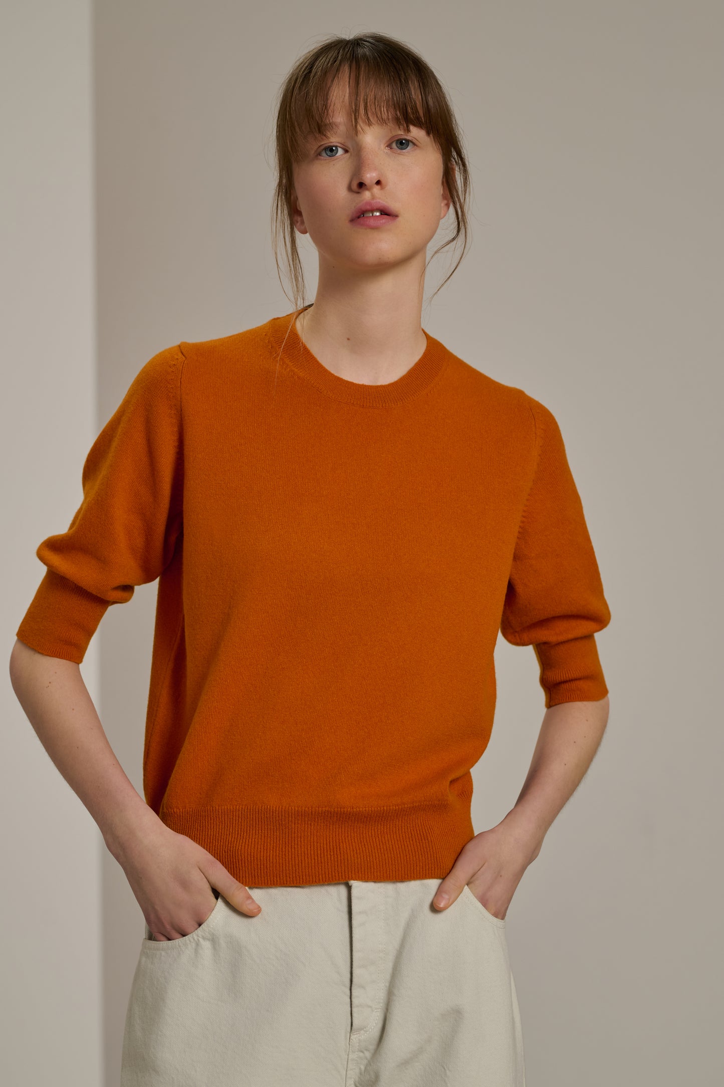 BAIE is a small short-sleeved jumper, like a winter T-shirt. Knitted in cashmere yarn, its softness is worn directly on the skin. It has a straight and loose fit, away from the body to ensure comfort and ease.